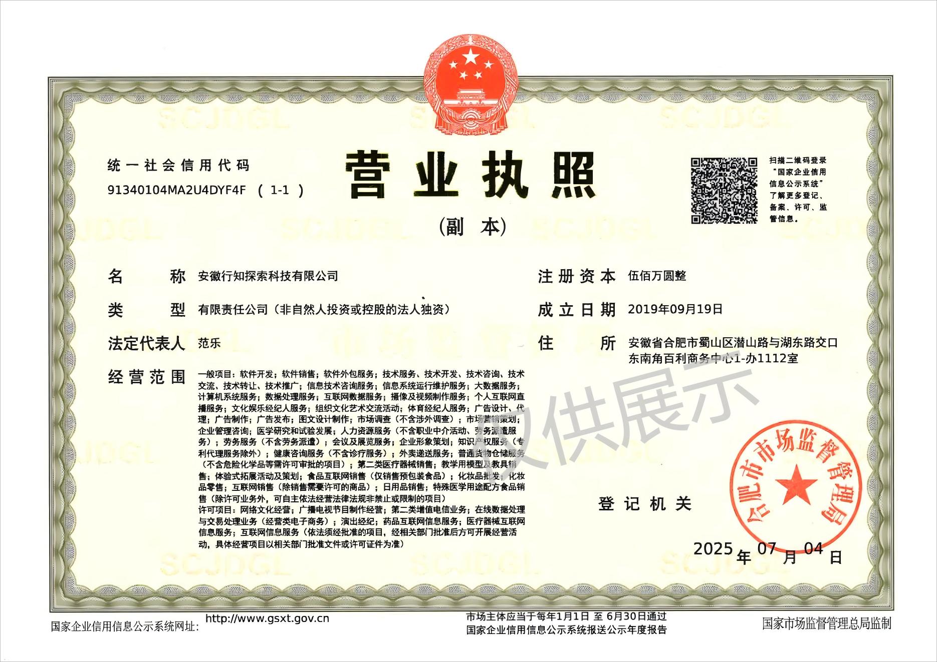 安徽行知探索科技有限公司成立于2019年09月19日,注册地位于安徽省合肥市蜀山区潜山路与湖东路交口东南角百利商务中心1-办1112室,法定代表人为范乐。诚信经营:公司坚守诚信原则,对客户、员工和社会负责,树立良好的企业形象。追求卓越:公司追求卓越的业绩和品质,不断提升自身的核心竞争力,实现可持续发展。